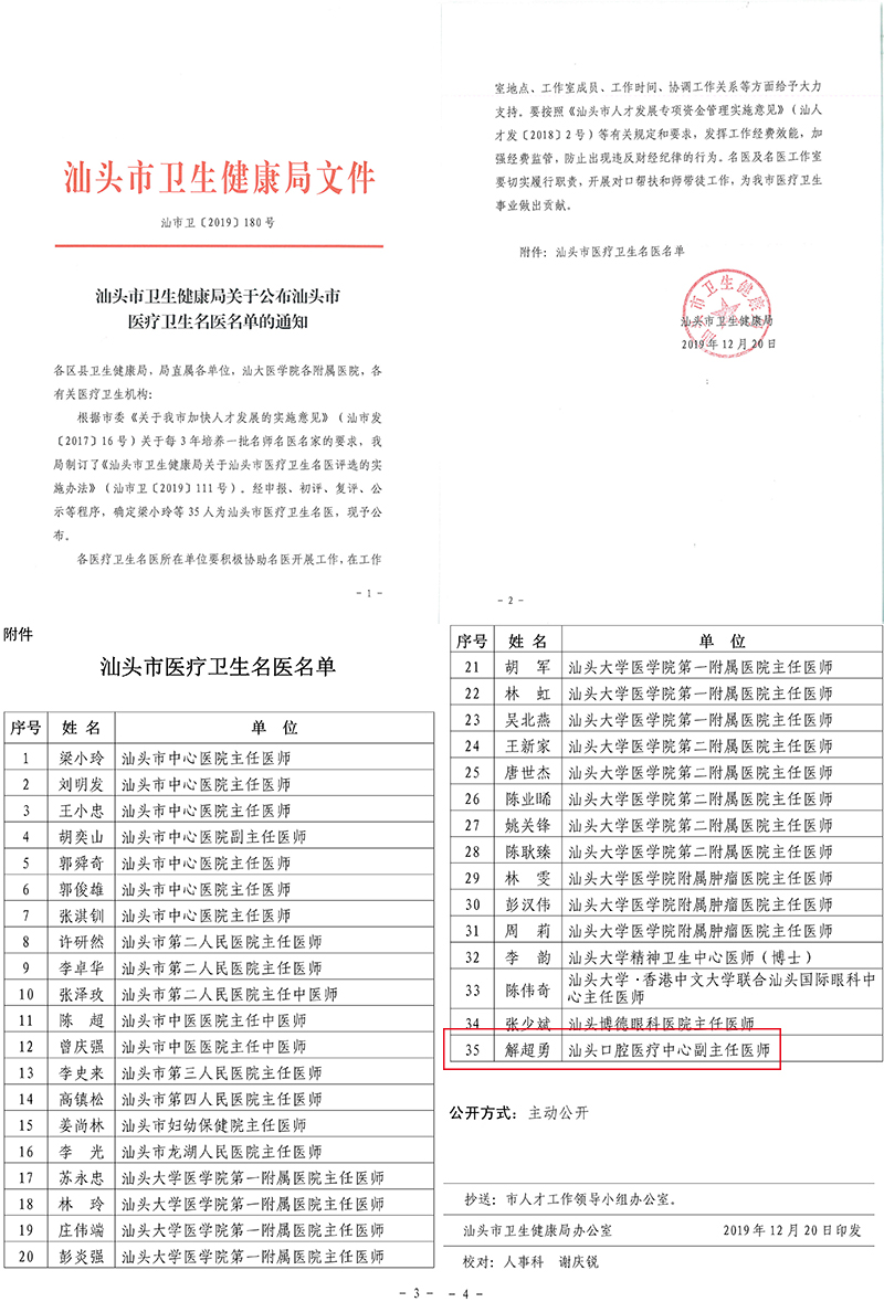 日前,汕頭市醫(yī)療衛(wèi)生名醫(yī)評選結(jié)果公布。經(jīng)評申報(bào)、初評、復(fù)評、公示等程序,35名來自各醫(yī)療機(jī)構(gòu)的醫(yī)務(wù)人員獲殊榮,我院副院長解超勇榜上有名,是唯一上榜的口腔醫(yī)師。我院將積極協(xié)助解副院長開展工作,助力他發(fā)揮在口腔醫(yī)學(xué)教育科研等方面的帶頭作用,推進(jìn)口腔醫(yī)療人才隊(duì)伍建設(shè)和口腔醫(yī)療事業(yè)發(fā)展,助推汕頭加快打造粵東醫(yī)療高地。