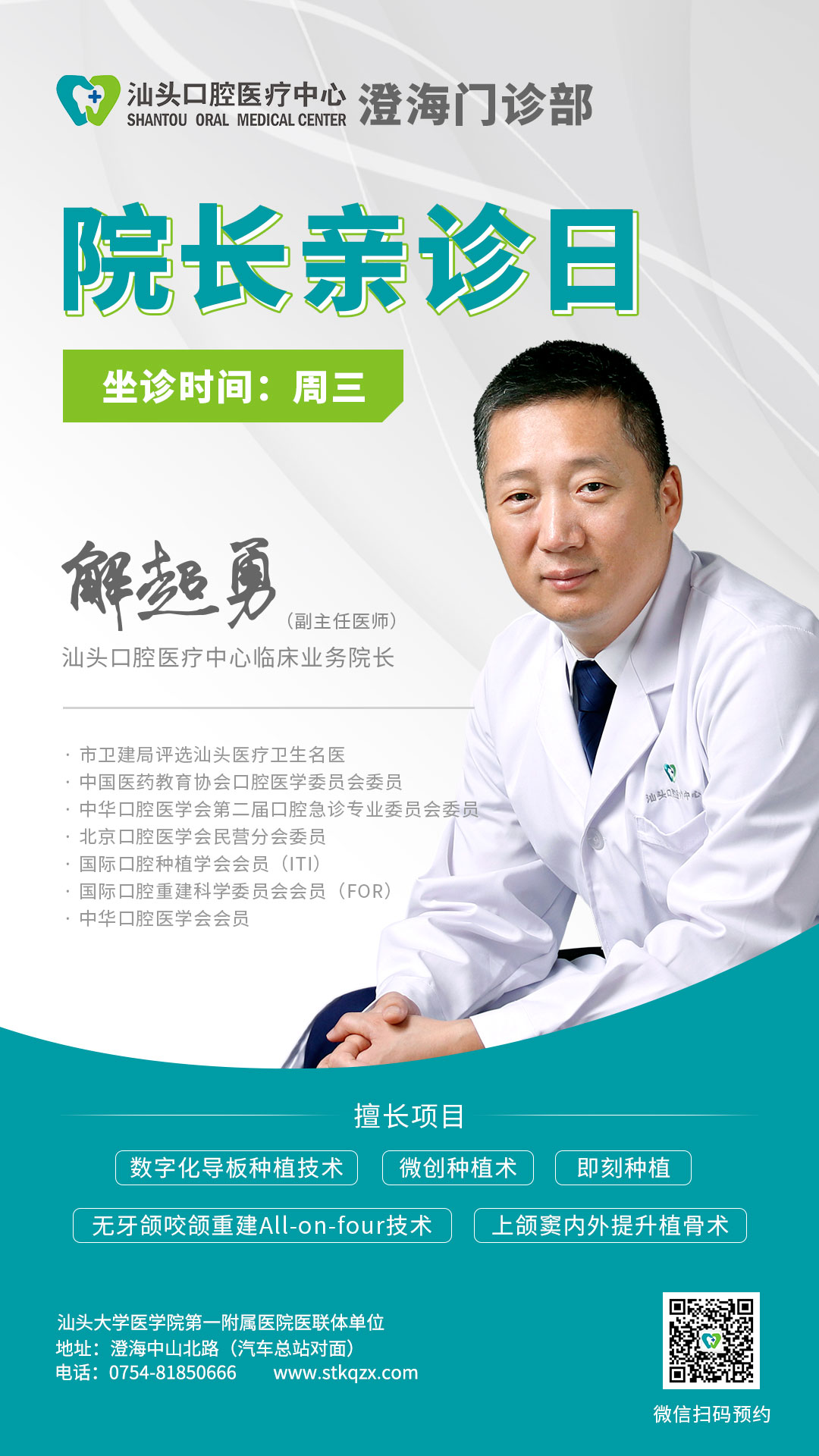 為方便澄海廣大牙缺失患者方便就醫(yī),讓多顆、全口及疑難缺牙患者得到權(quán)威有效的診療,我院澄海門診部特別推出“院長親診日”,解超勇副院長將于每周三到澄海門診部坐診,為牙缺失患者定制專業(yè)、有效的個體化治療方案。
