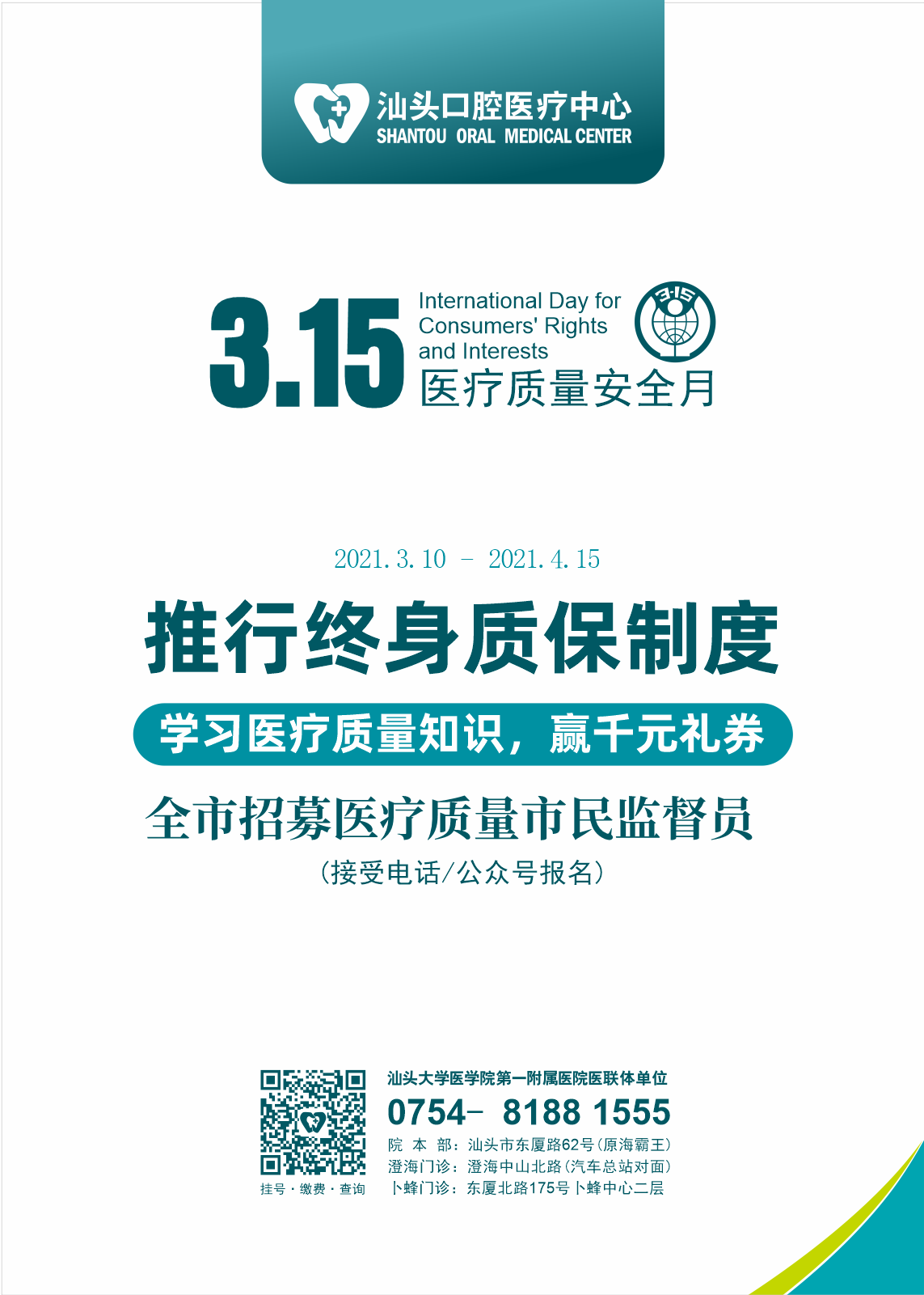 我院推行終身質(zhì)保制度,承諾患者開(kāi)展種植牙、正畸項(xiàng)目可根據(jù)治療年限獲得不同程度的權(quán)益保障;擬面向全市聘用醫(yī)療質(zhì)量市民監(jiān)督員,協(xié)助醫(yī)院做好醫(yī)療質(zhì)量持續(xù)提升工作。