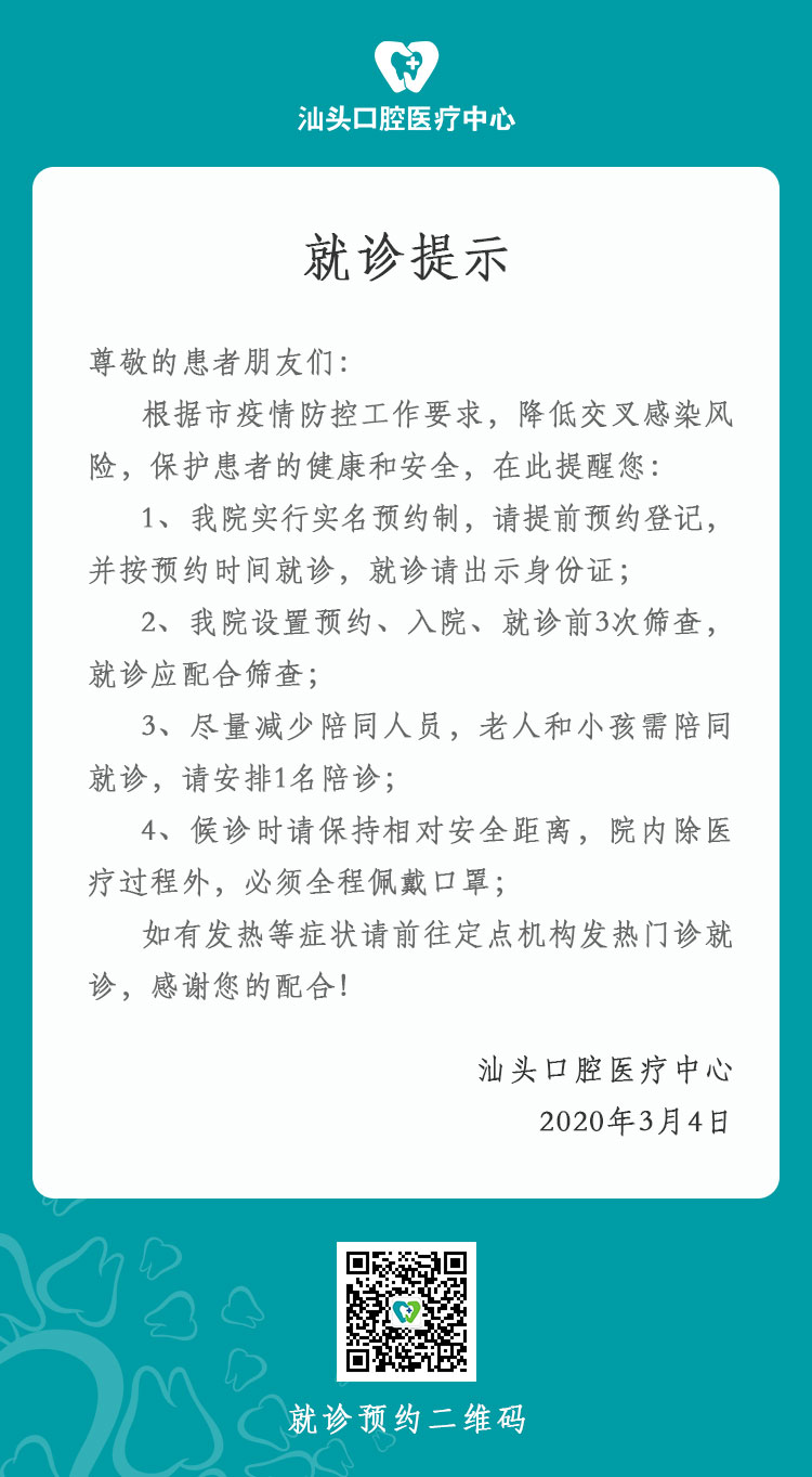 請?zhí)崆巴ㄟ^我院微信公眾號或撥打電話0754-81881555進行預約登記,并嚴格按預約時間到院,憑身份證就診。