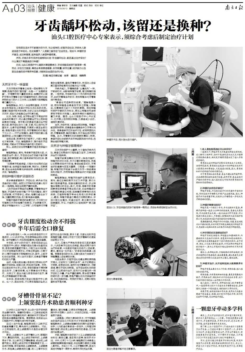 “患者也可選擇即刻修復(fù)。”據(jù)解超勇介紹,即刻種植是在患者拔牙后立即植入種植體,無需等待三到六個月的恢復(fù)期。即刻種植可保護(hù)牙齦的天然形態(tài),再加上種植體可參照原有牙根的方向植入,能夠獲得較為理想的位置及深度。據(jù)悉,汕頭口腔醫(yī)療中心開診至今,已開展上百例即刻種植,為患者減少創(chuàng)傷,縮短恢復(fù)時間。